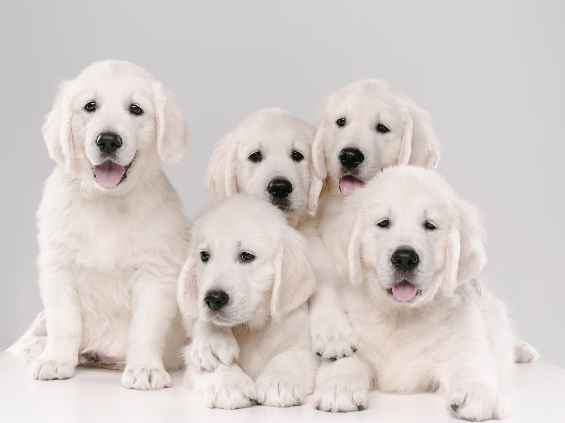 Пять щенков золотистого ретривера на сером фоне Обои для рабочего стола 1152x864