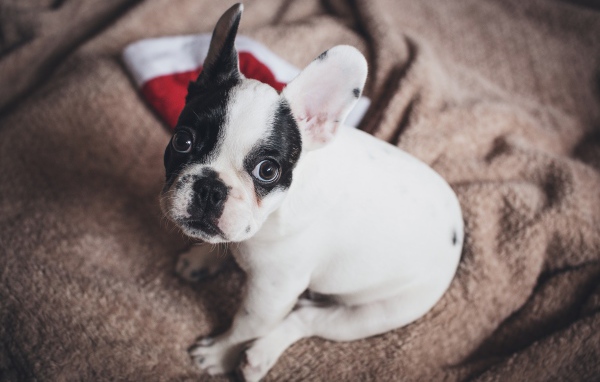 Удивленный французский бульдог сидит на кровати Обои для рабочего стола 600x382