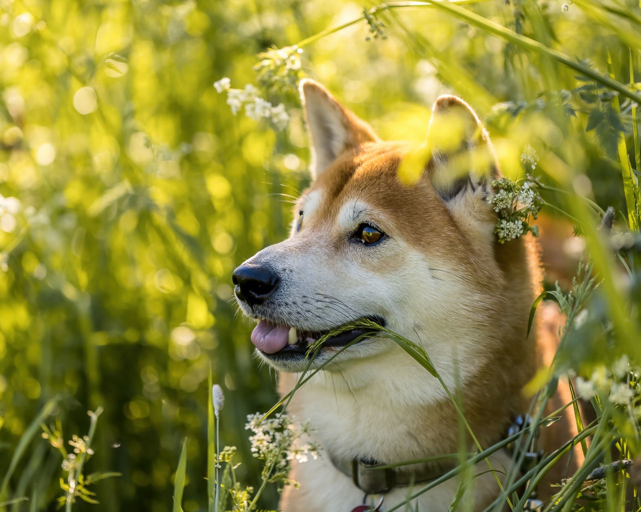 Красивая собака шиба ину сидит в зеленой траве Обои для рабочего стола 1280x1024