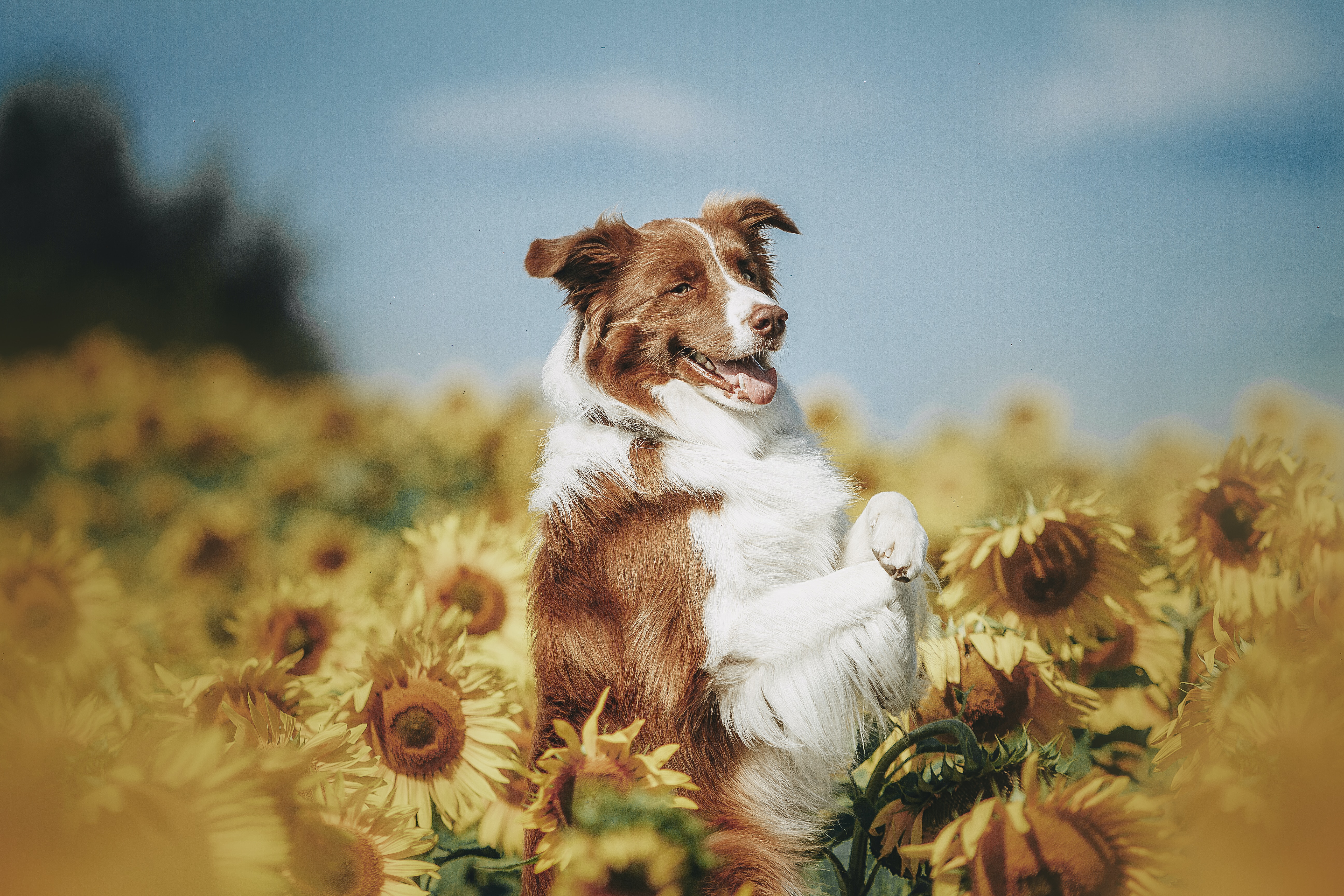 Собака породы бордер колли в подсолнухах - 5184x3456