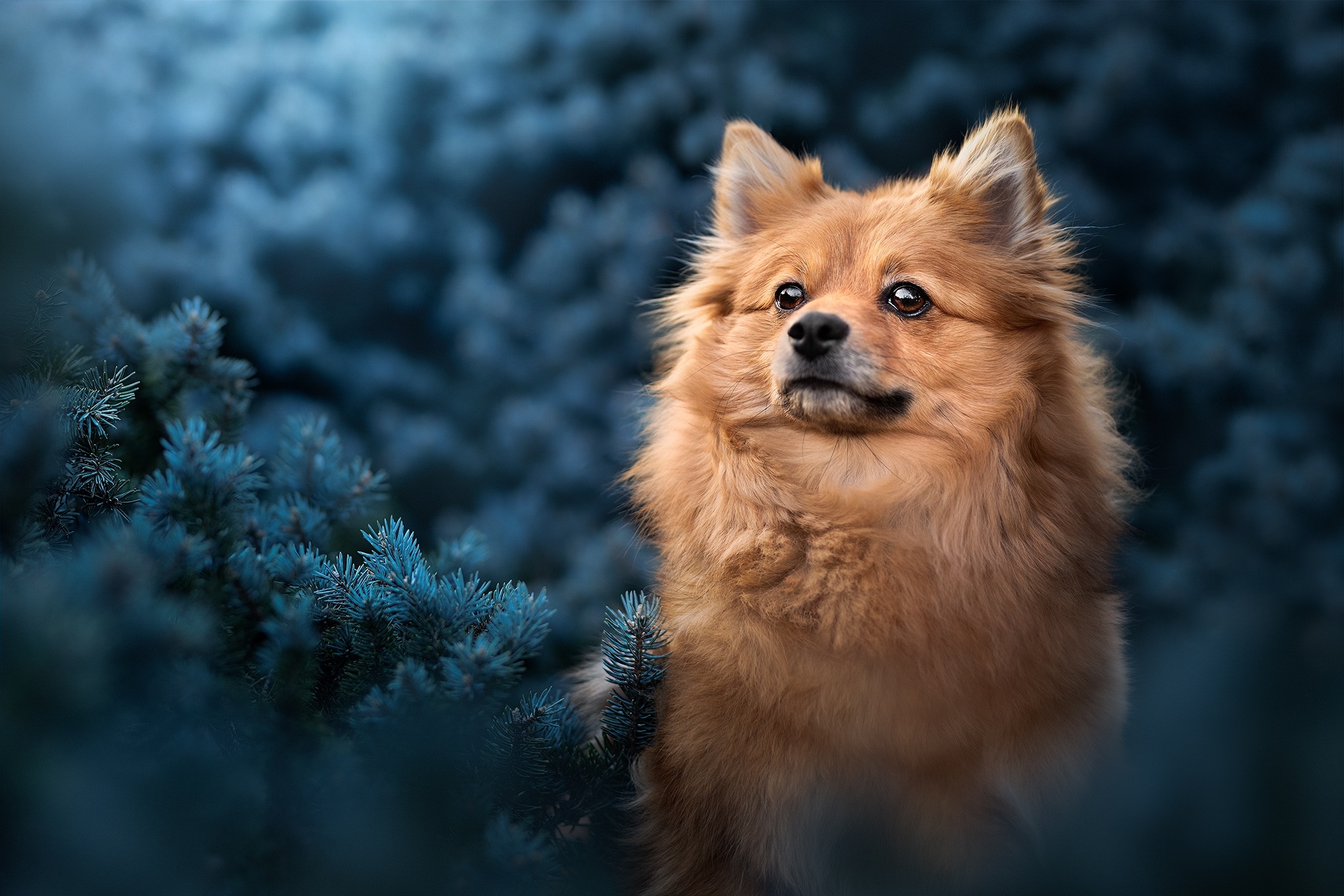 Померанский шпиц сидит в еловых ветках - 2048x1365