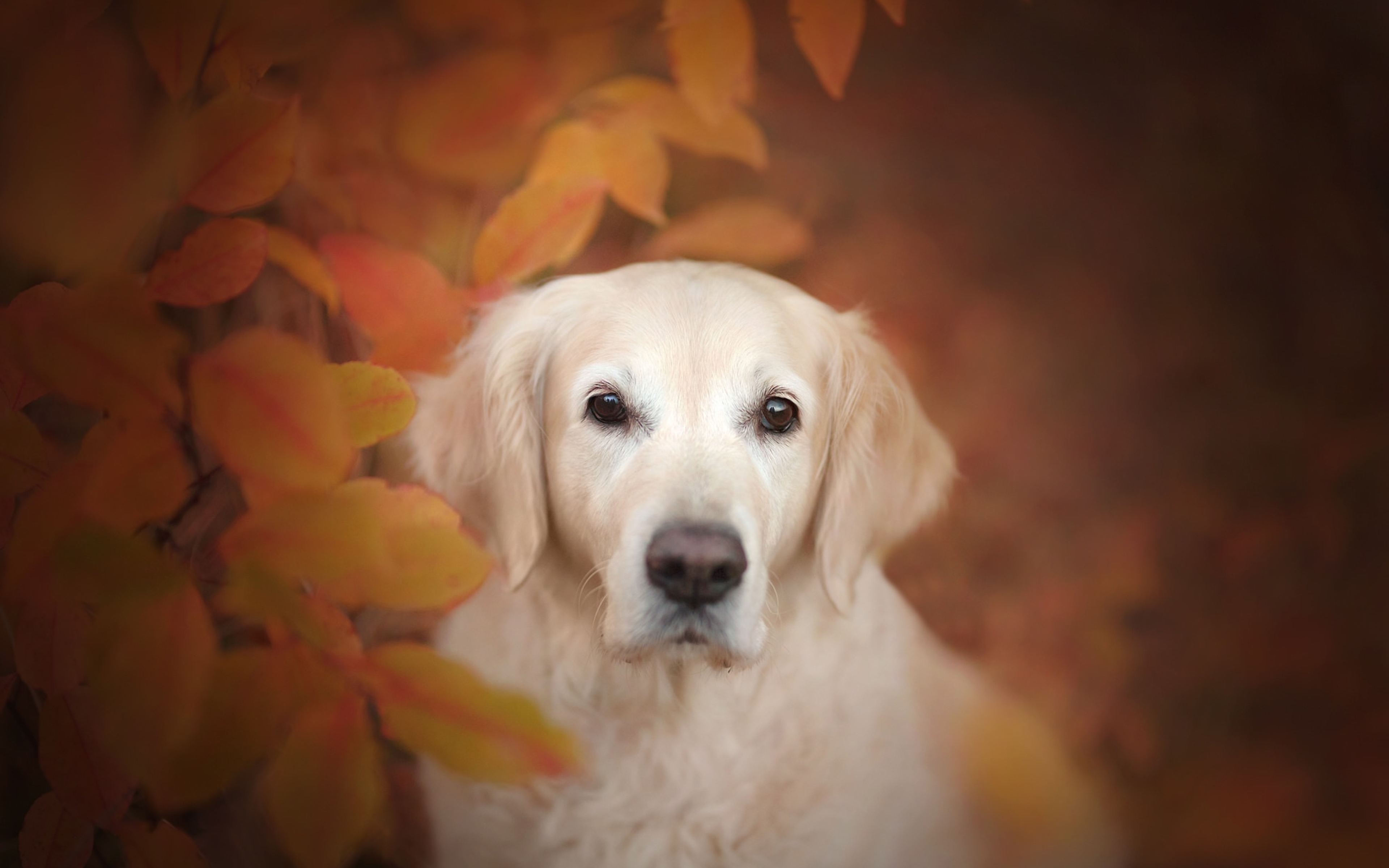 Золотистый ретривер прячется в желтых листьях - 3840x2400