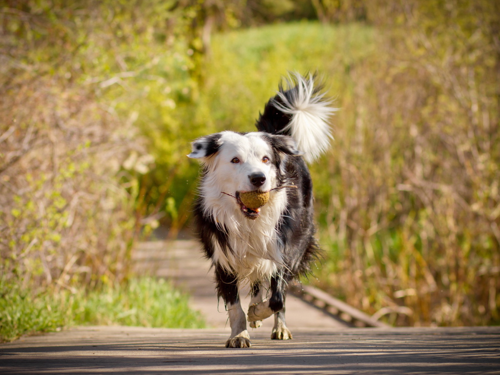 Пушистая собака с мячом Обои для рабочего стола 1024x768