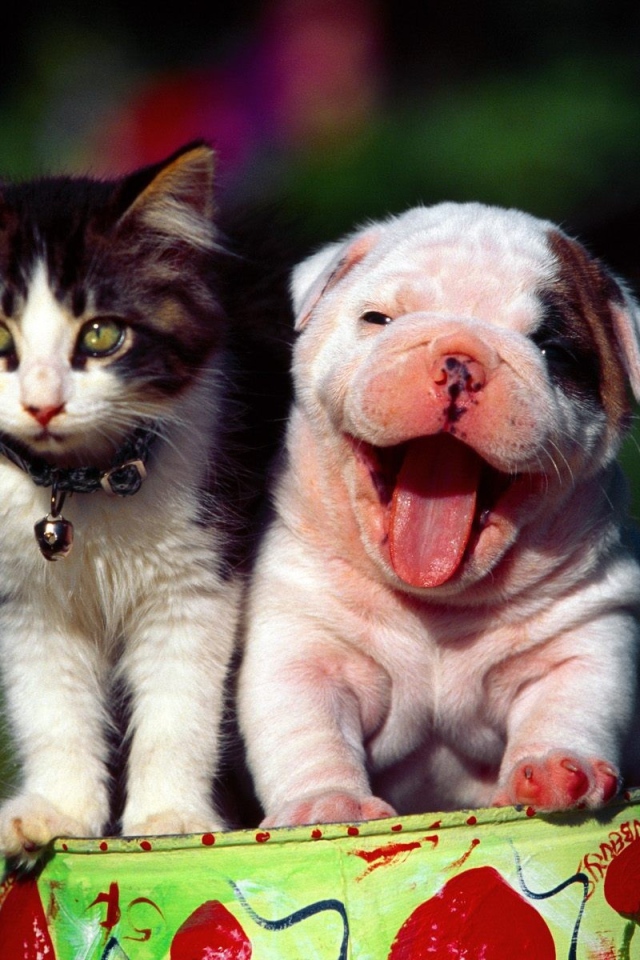 Щенок шарпей с котенком Обои для рабочего стола 640x960