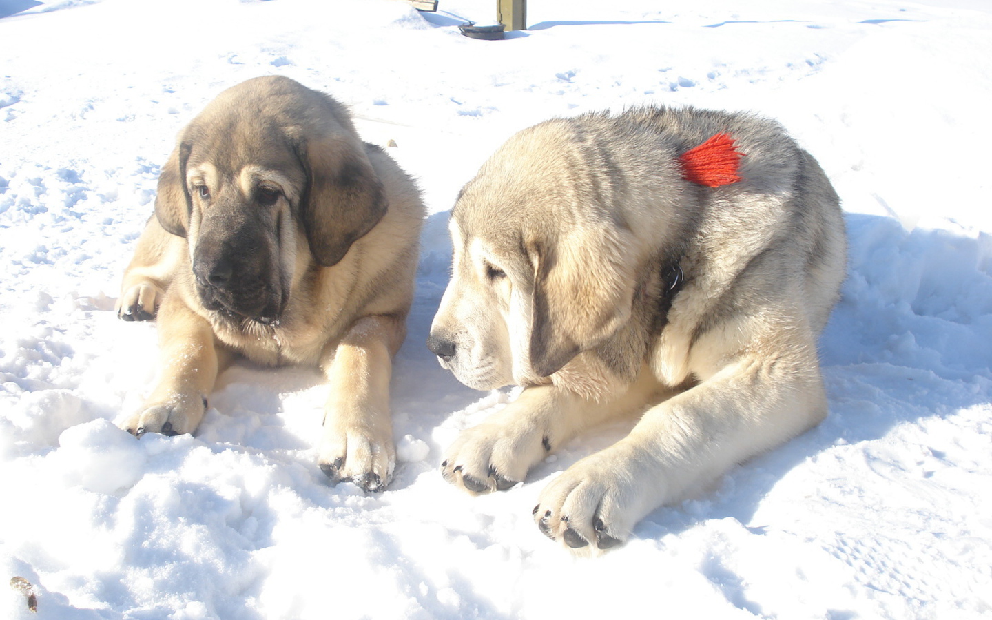 Маленькие испанские мастифы на снегу Обои для рабочего стола 1440x900