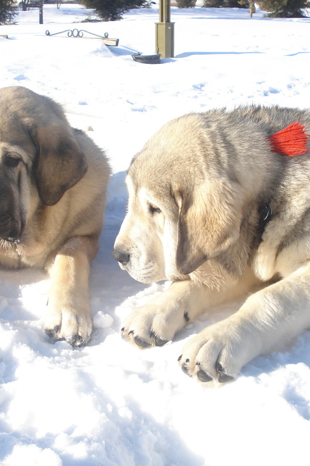 Маленькие испанские мастифы на снегу Обои для рабочего стола 640x960
