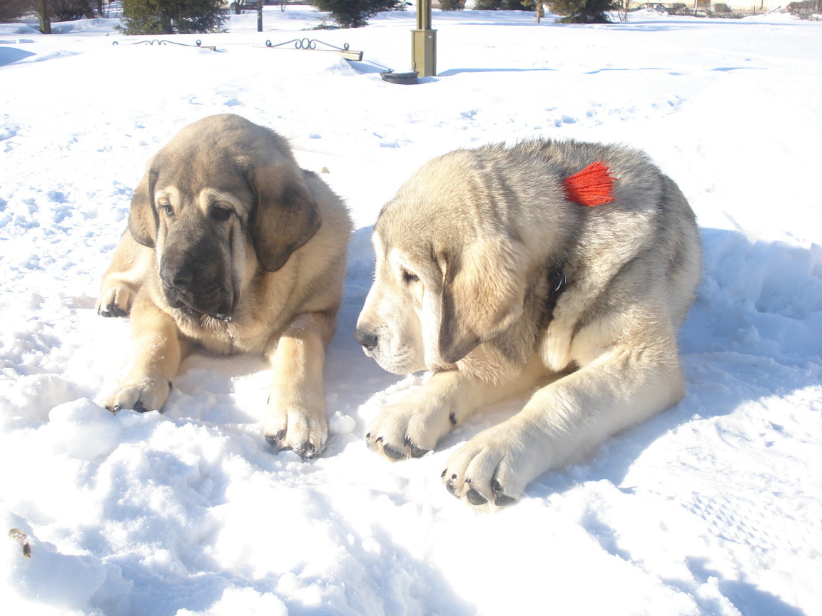 Маленькие испанские мастифы на снегу Обои для рабочего стола 1152x864