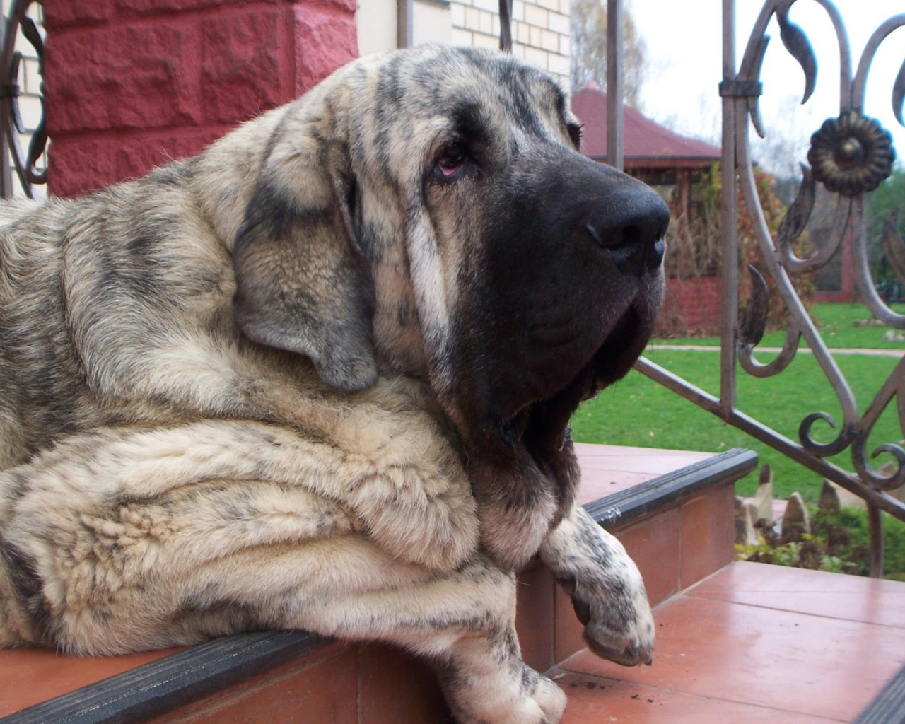 Испанский мастиф лежащий на лестнице Обои для рабочего стола 1280x1024