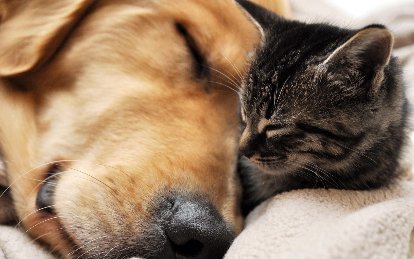Золотой терьер спит с кошкой Обои для рабочего стола 1680x1050