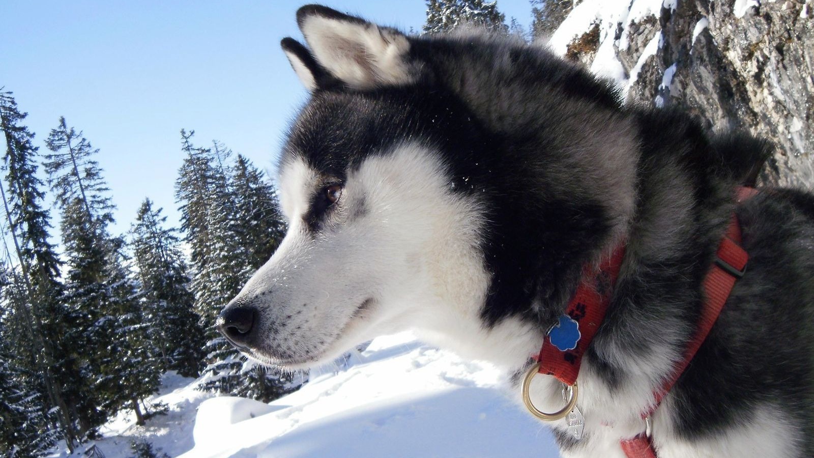 Аляскинский маламут с красным ошейником Обои для рабочего стола 1600x900