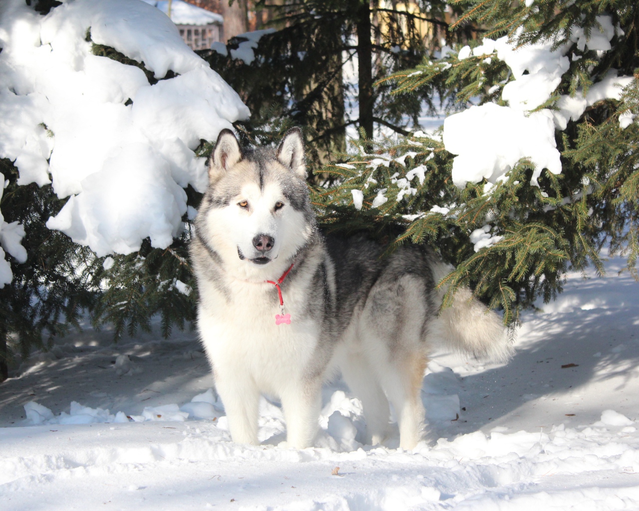 Красивый аляскинский маламут стоит в сугробе Обои для рабочего стола 1280x1024