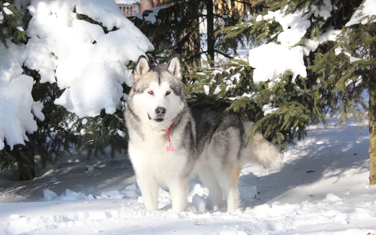 Красивый аляскинский маламут стоит в сугробе - 3456x2304