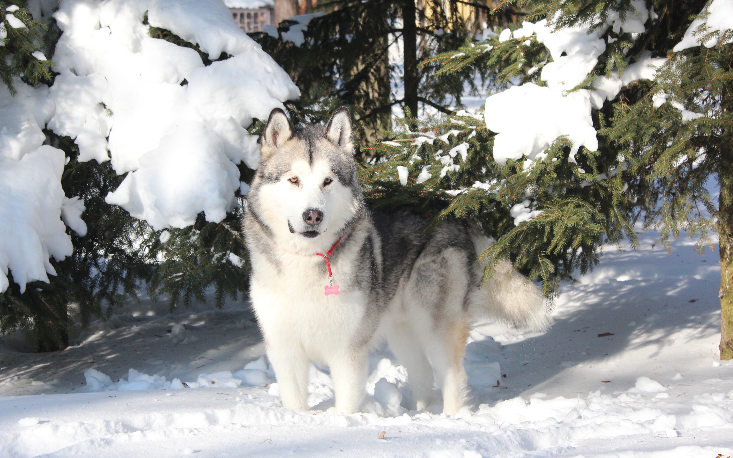 Красивый аляскинский маламут стоит в сугробе - 3456x2304