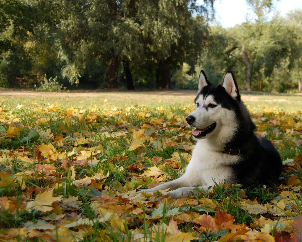 Аляскинский маламут на осенних листьях Обои для рабочего стола 1280x1024