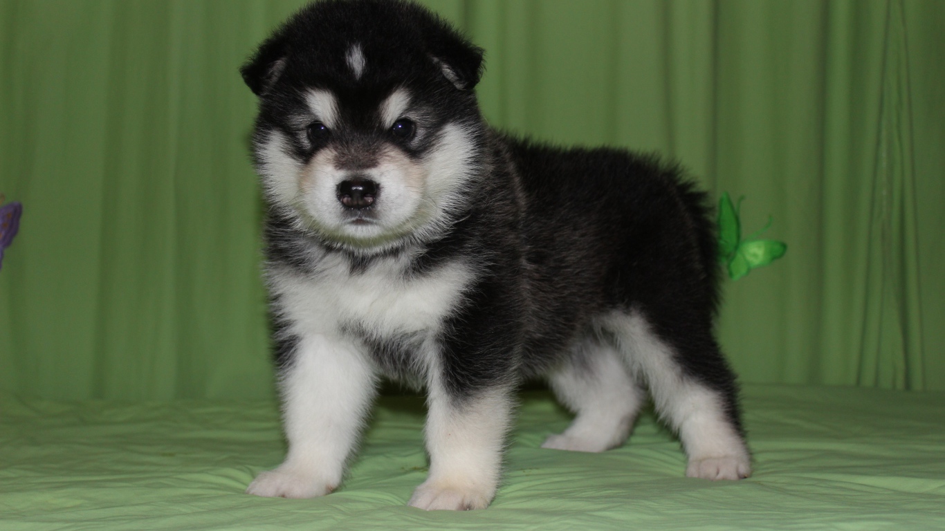 Щенок аляскинского маламута на зелёном фоне Обои для рабочего стола 1366x768
