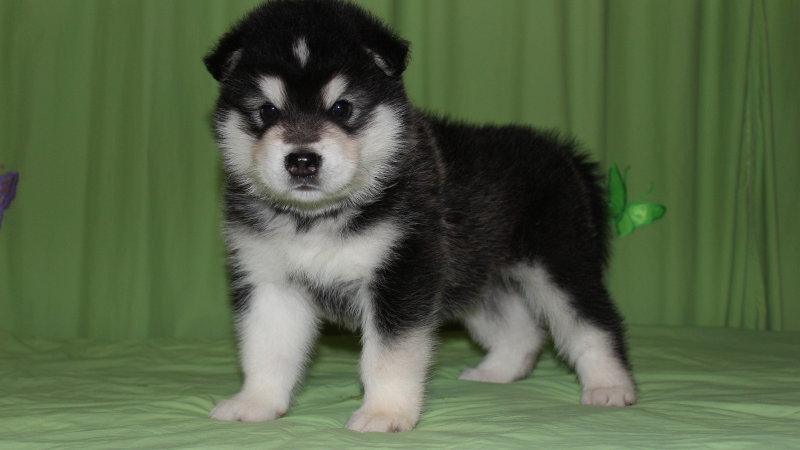 Щенок аляскинского маламута на зелёном фоне - 5184x3456