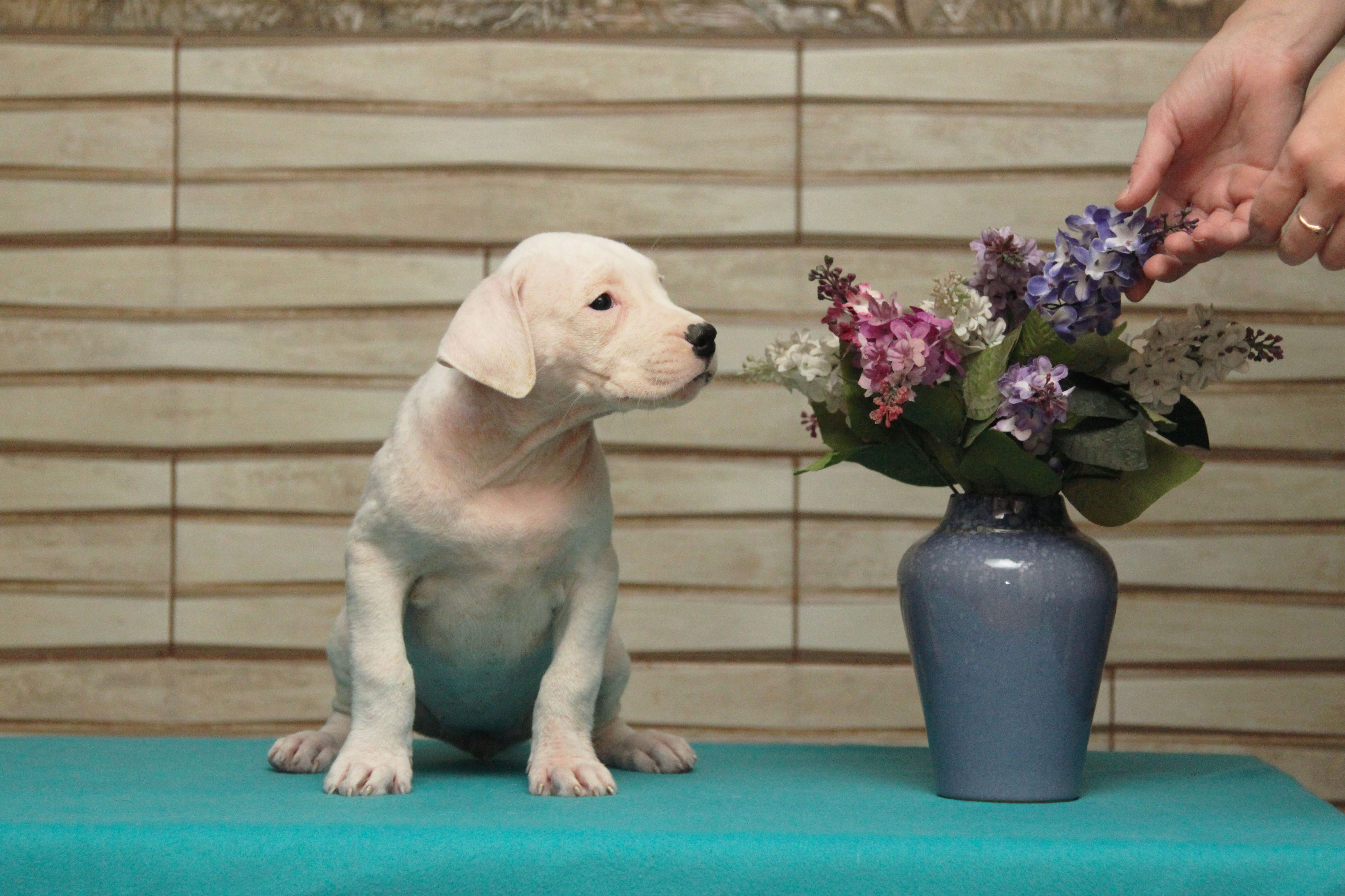 Щенок аргентинского дога и цветы