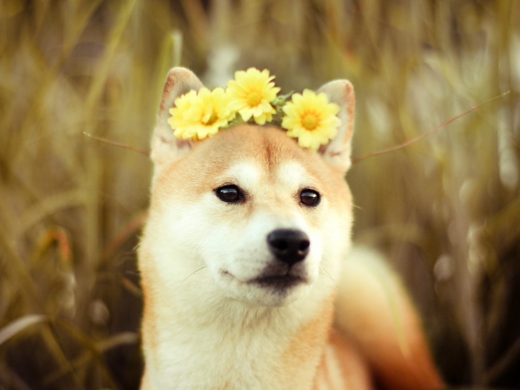 Собака с цветами на голове Обои для рабочего стола 1024x768