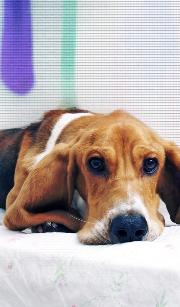 Красивый бассет-хаунд на кровати Обои для рабочего стола 600x1024