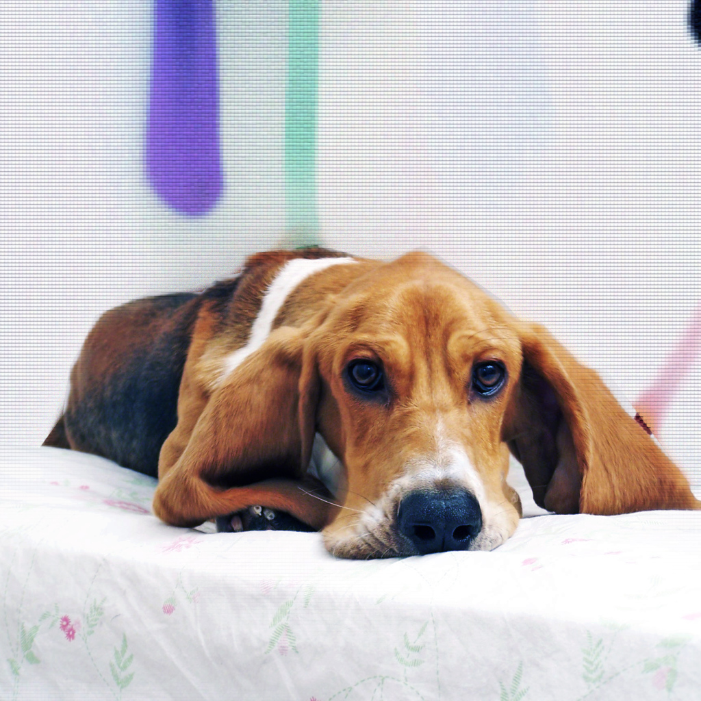 Красивый бассет-хаунд на кровати Обои для рабочего стола 1024x1024