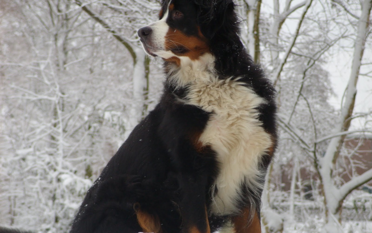 Бернская пастушья собака сидит в сугробе Обои для рабочего стола 1280x800