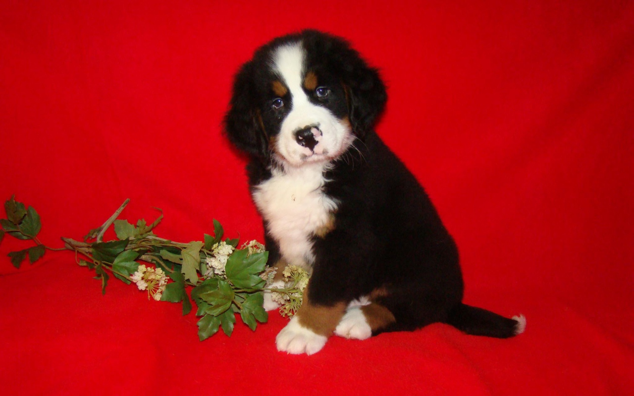 Щенок бернской пастушьей собаки и цветок Обои для рабочего стола 1280x800