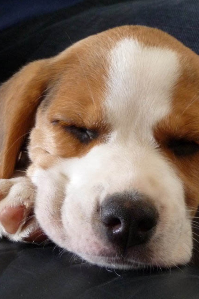 Собака породы бигль смотрит десятый сон на кресле Обои для рабочего стола 640x960