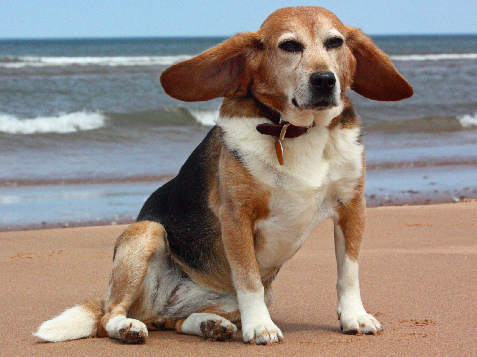 Взрослая смешная собака породы бигль возле моря Обои для рабочего стола 1600x1200