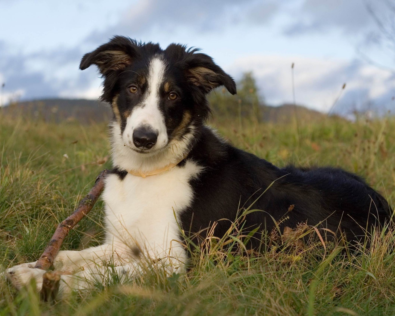 Бордер-колли лежит с палкой Обои для рабочего стола 1280x1024