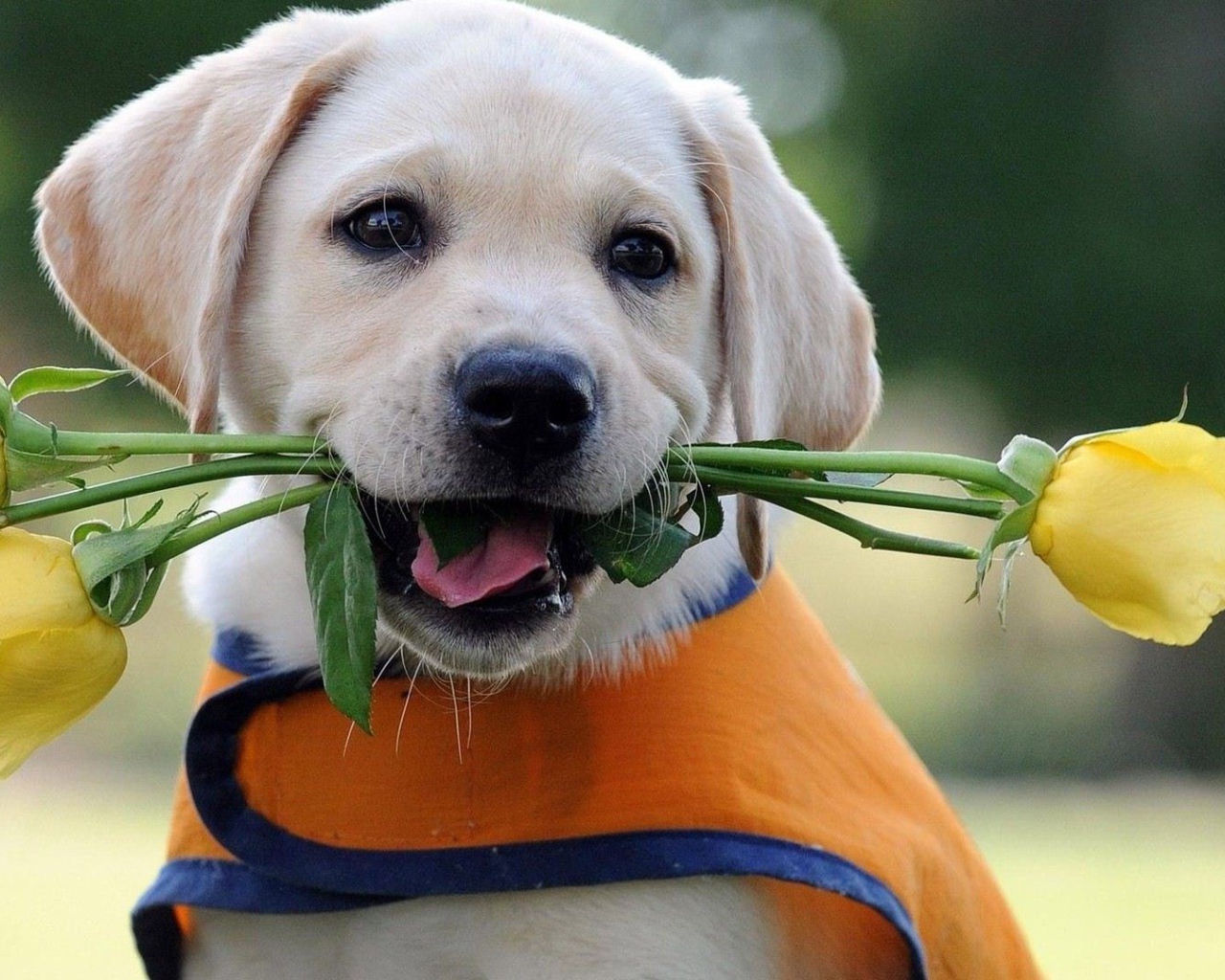 Щенок дарит жёлтые розы Обои для рабочего стола 1280x1024