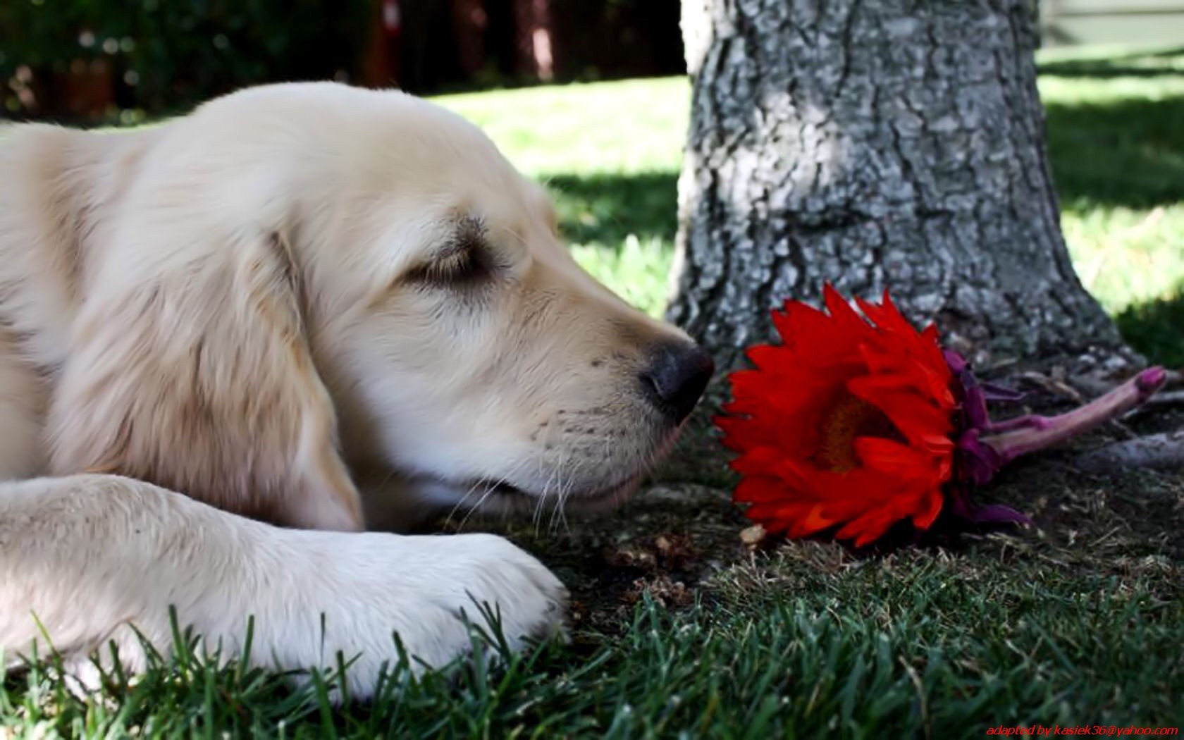Собака нюхает цветок Обои для рабочего стола 1680x1050