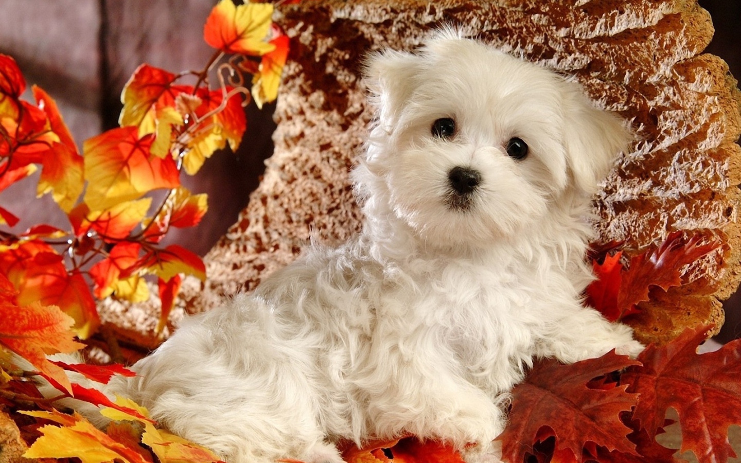 Милая болонка среди листвы Обои для рабочего стола 1440x900