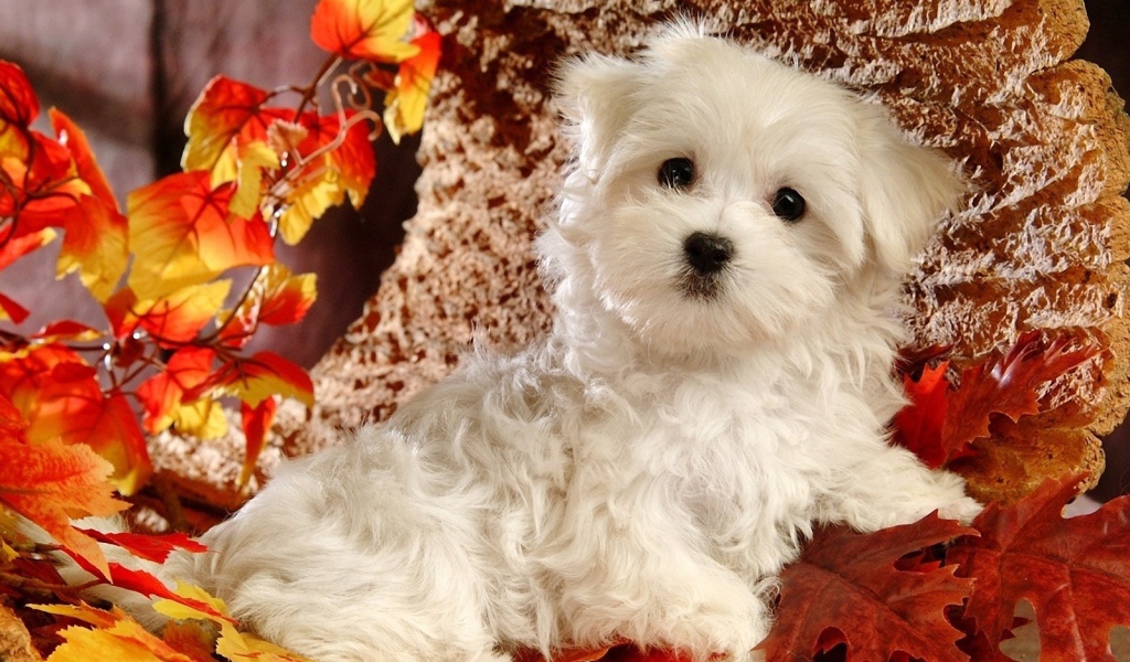 Милая болонка среди листвы Обои для рабочего стола 1024x600