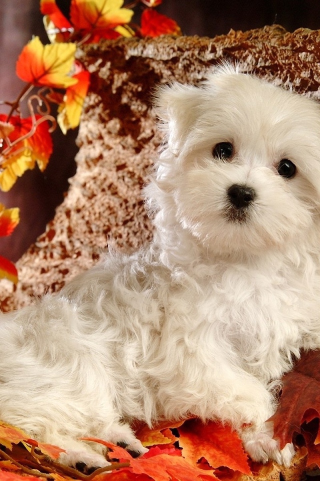 Милая болонка среди листвы Обои для рабочего стола 640x960