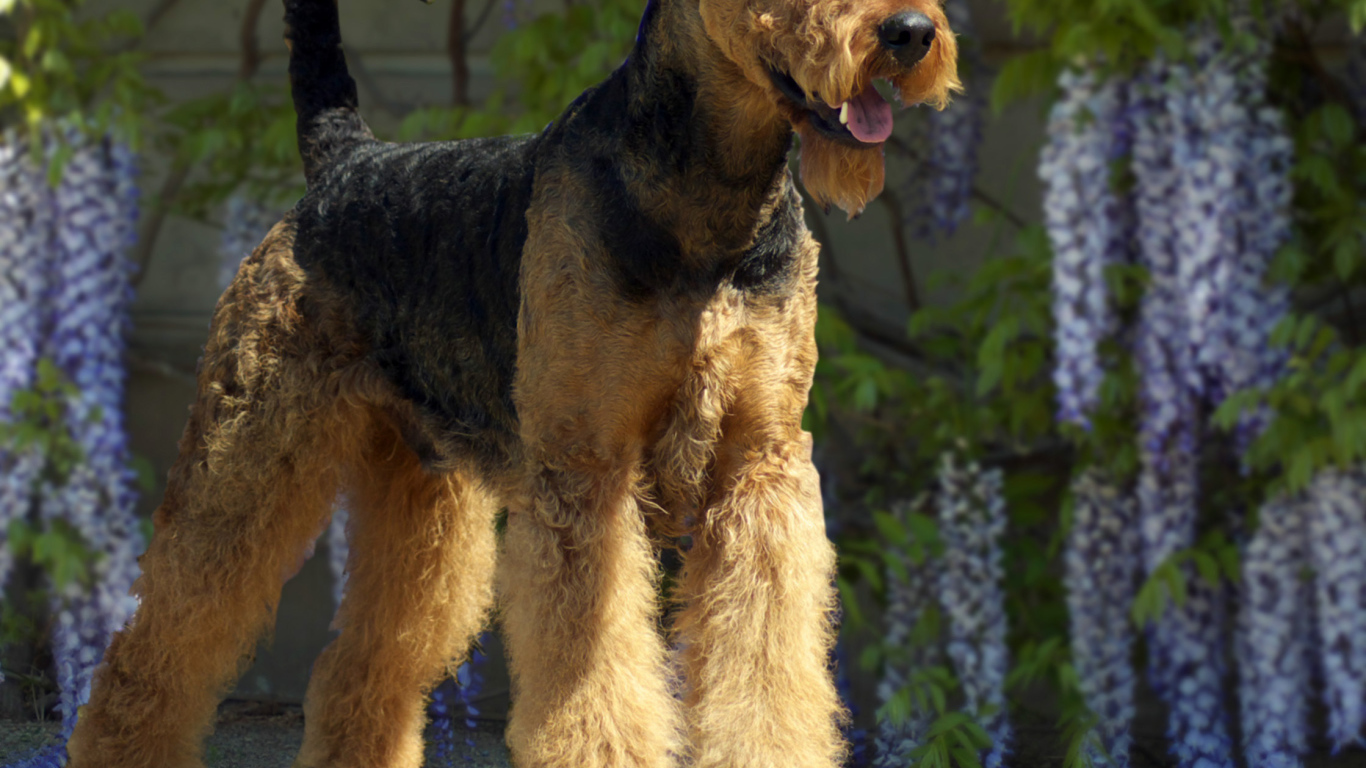 Эрдельтерьер на фоне цветов Обои для рабочего стола 1366x768