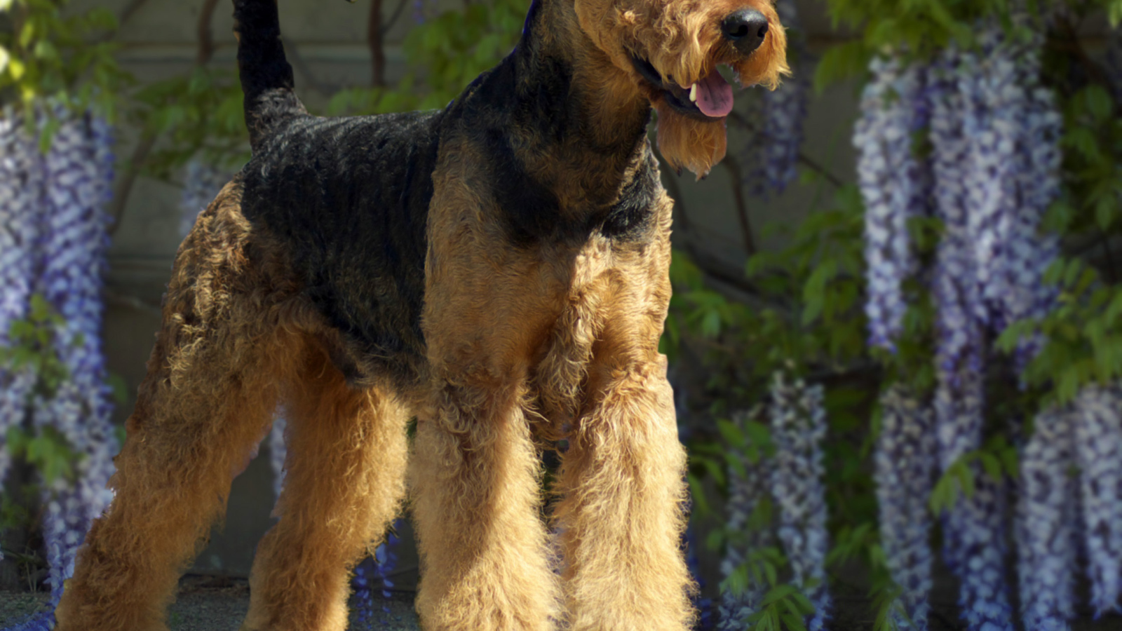 Эрдельтерьер на фоне цветов Обои для рабочего стола 1600x900