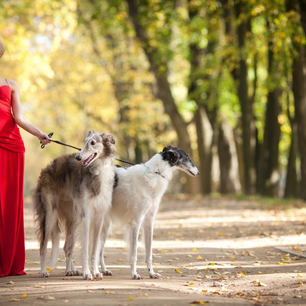 Девушка в красном с борзыми собаками Обои для рабочего стола 1024x1024