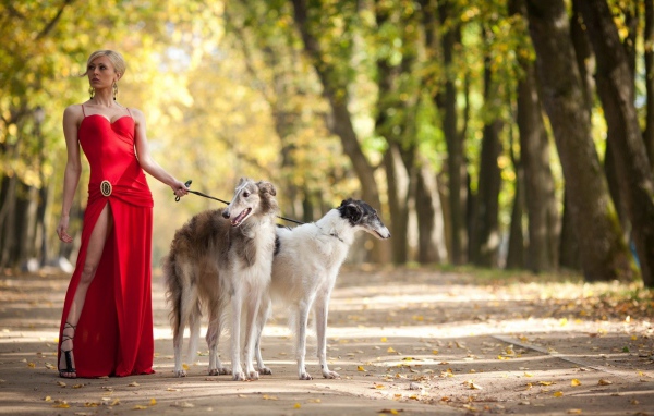 Девушка в красном с борзыми собаками Обои для рабочего стола 600x382