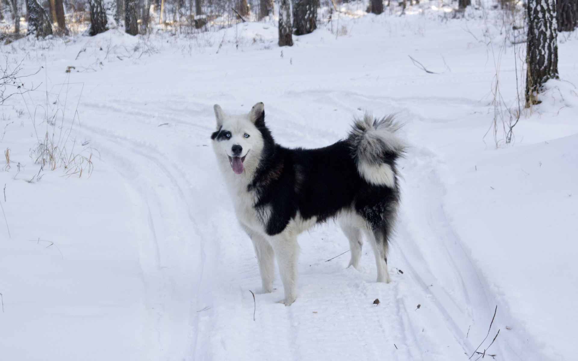 Черно белая лайка на снегу Обои для рабочего стола 1920x1200