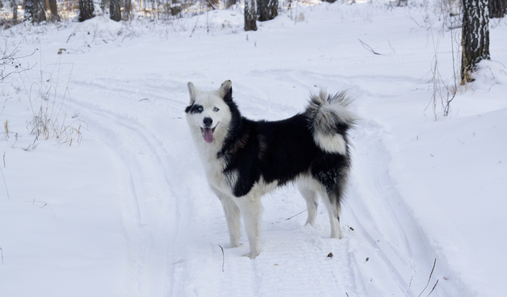 Черно белая лайка на снегу Обои для рабочего стола 1024x600