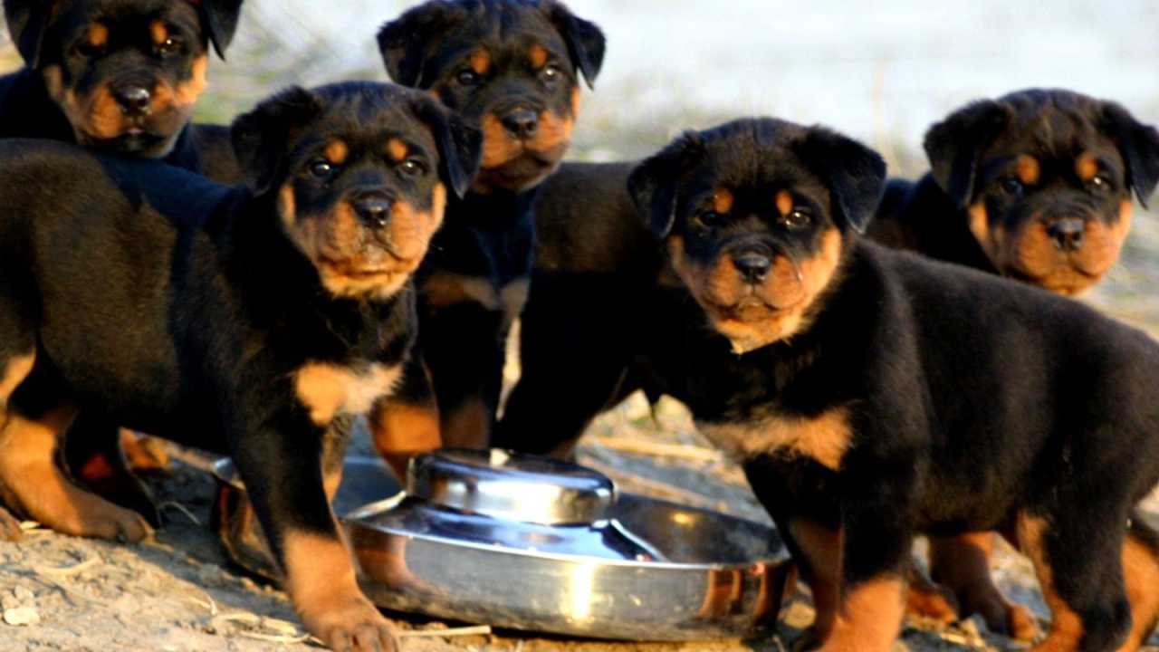 Щенки ротвейлера пьют воду Обои для рабочего стола 1280x720