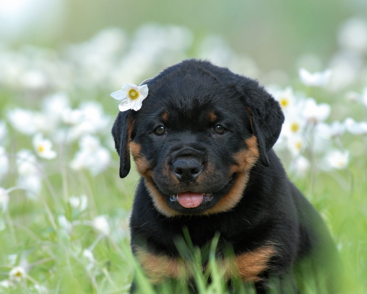 Щенок ротвейлера с цветком Обои для рабочего стола 1280x1024