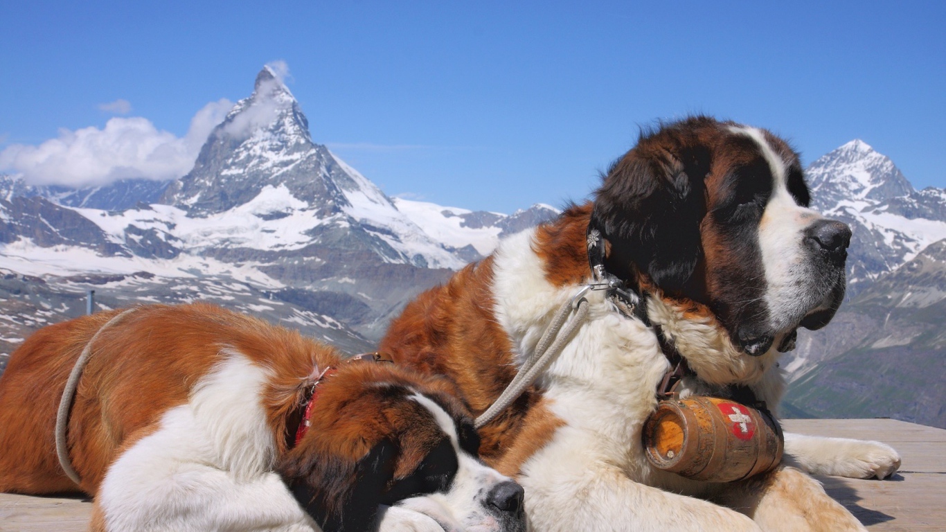 Два сенбернара в горах Обои для рабочего стола 1366x768