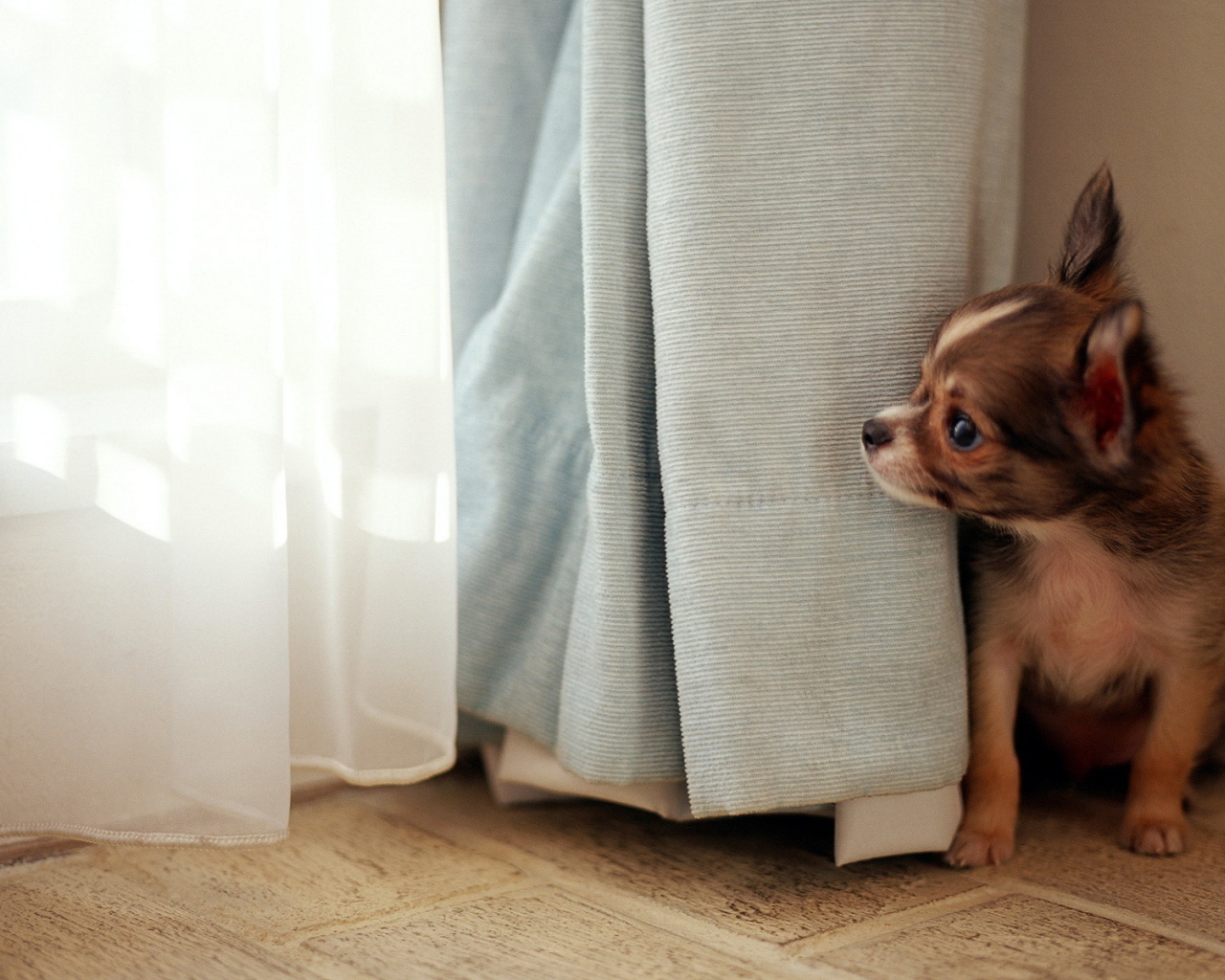 Щенок чихуахуа за шторой Обои для рабочего стола 1280x1024