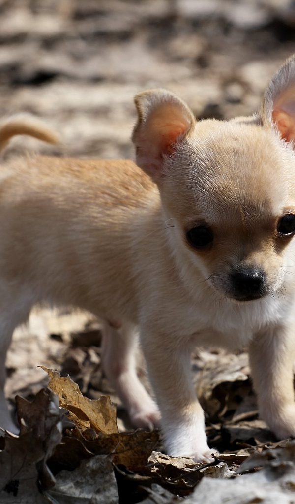 Щенок чихуахуа на листьях Обои для рабочего стола 600x1024