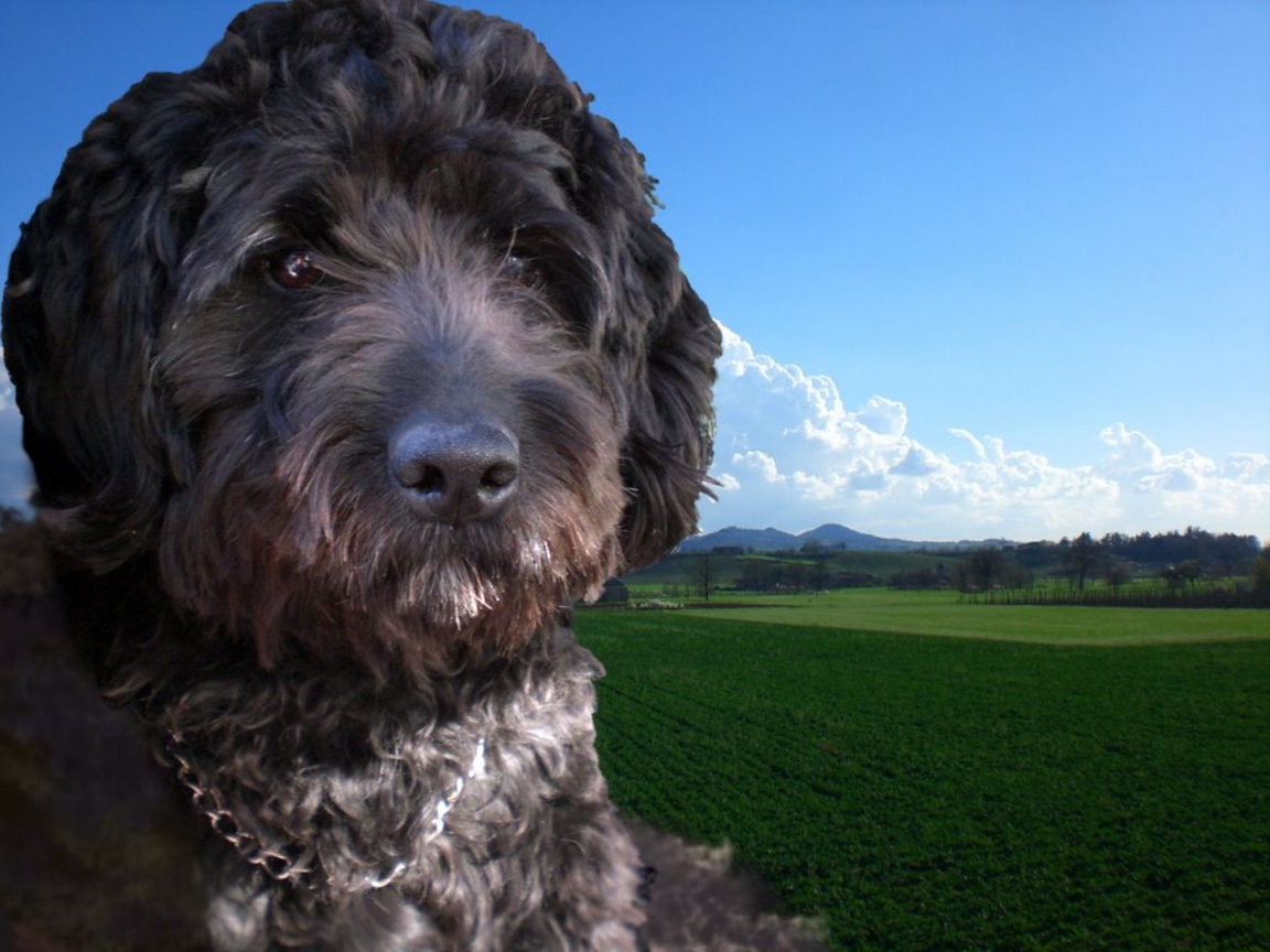 Собака барбет на фоне поля Обои для рабочего стола 1152x864