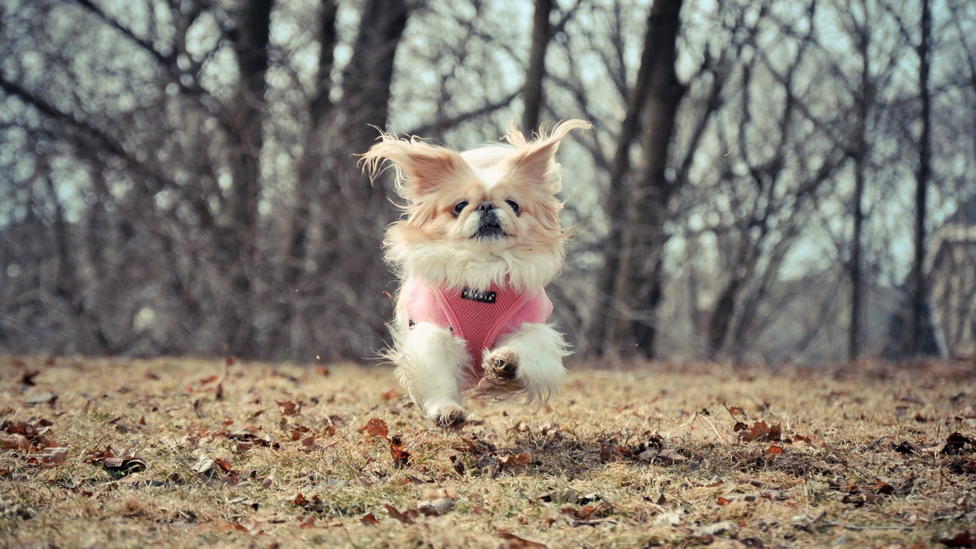 Обои: Маленькая собака бежит по опавшим листьям