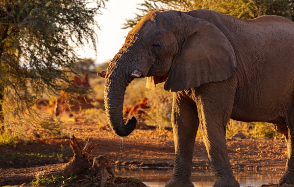 Большой серый слон пьет воду из реки Обои для рабочего стола 600x382