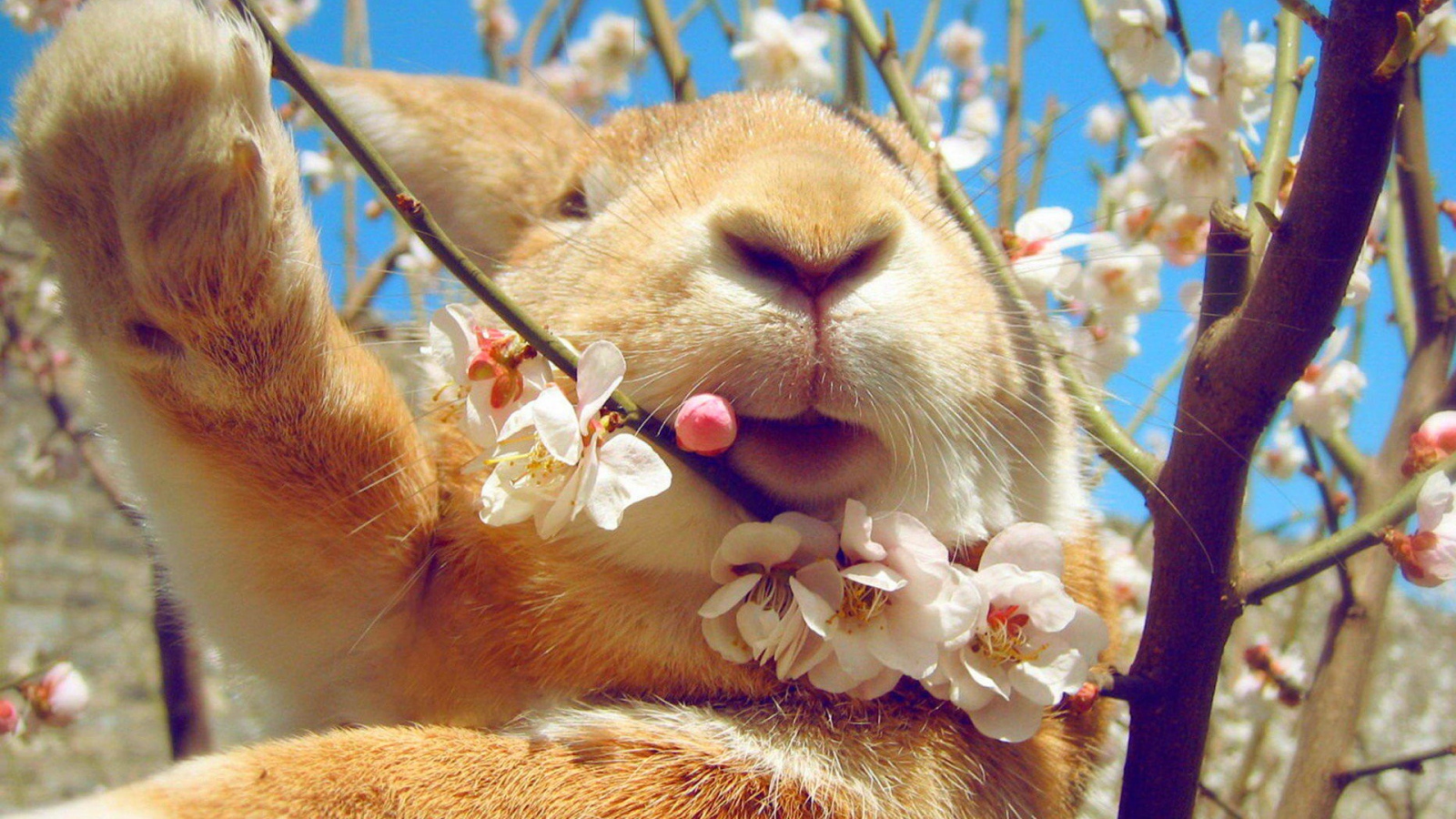 Кролик ест цветы на дереве Обои для рабочего стола 1600x900