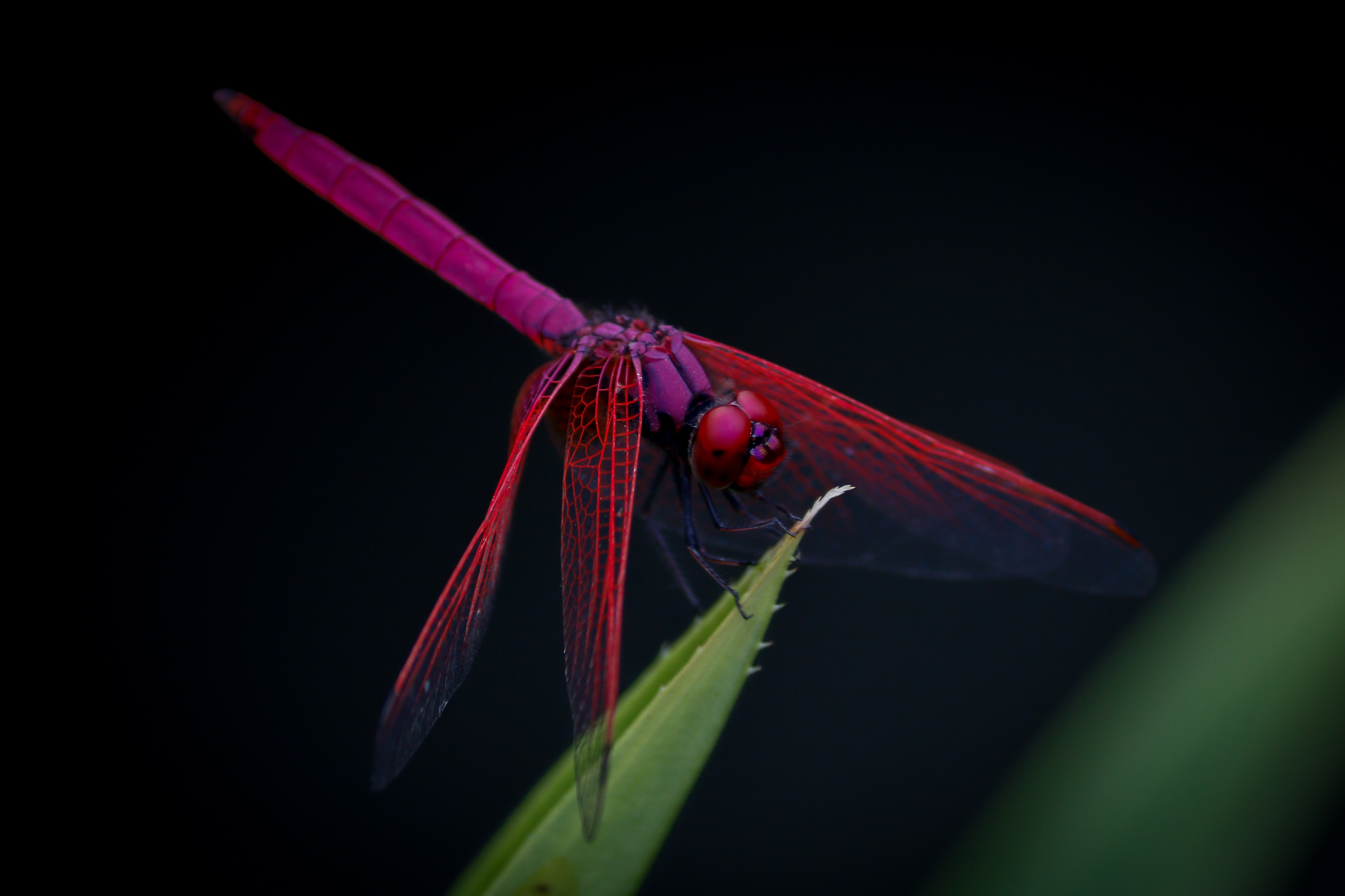 Красная стрекоза сидит на зеленом листе - 4161x2774